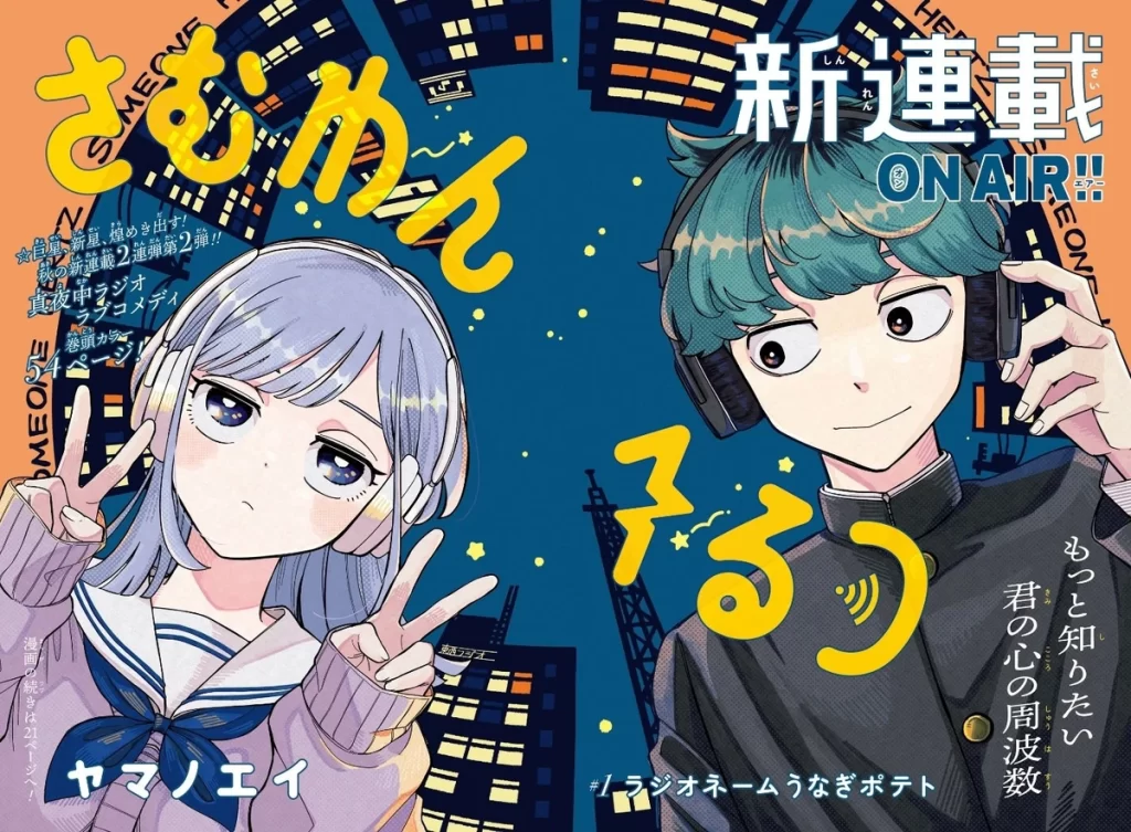 O primeiro que eu quero sugerir para vocês é esse mangá de comédia romântica super fofo, que começou a publicação em Setembro de 2025. Ele conta a história de Mimei, um jovem que adora ouvir programas de comédia noturnos. Quando ele compartilha esse hábito com sua colega de classe misteriosa Kurage, descobre que ela é a responsável por mandar os comentários mais hilários para o programa. Determinado a conseguir ser tão engraçado quanto ela, nasce aí uma rivalidade que será regada de muito humor, amizade e algo mais.